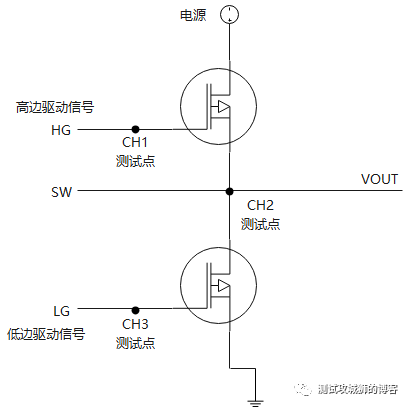 如下图所示,为同步整流电源芯片的部分电路图(使用外置MOS管),SW为电源芯片的功率输出引脚,HG、LG为高低边MOS的驱动信号,我们主要测试这个电路实际工作时有没有高低边MOS管同时导通的风险。