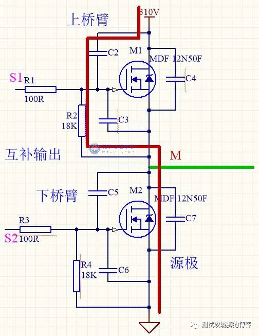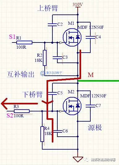 假设死区时间过后,上管先导通的瞬间,M点的电压从155V变成310V,有一个很高的dv/dt,而且瞬间会留下来一个很大的电流,那么理想情况下肯定是往负载那边流走,但事实上,会通过C5电容流到S2端,同时也会经过C6流到地。这是因为下管关闭,S2为0V,C6相当于短路,但更主要的电流还是流过C6。那么,既然对C6电容进行充电,C6的电压就会往上升,就有可能导致达到下管的开通阈值电压,那么下管会误导通。