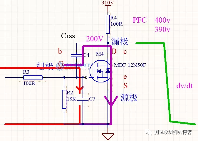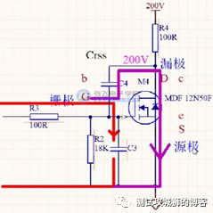 还是从死区说起,M点电压为155V,下管导通瞬间,M点电压被瞬间拉低,存在一个M点到地的回路。同时还会产生下面这条回路,同理,会对电容C3进行充电,必然对上管的栅极电压产生影响,也会导致在平台期间上管出现误触发。