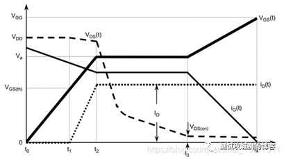 通过上图我们分析,在t0-t1这段时间内,VGS一开始随着栅极电荷的增加而增加,开始给Cgs充电,当电容达到门槛电压后,VGS=VGSth后,MOS开始进入导通状态。