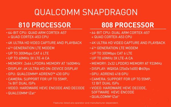 2015 年,高通旗下高端 CPU 骁龙 810 发生发热问题。事实上,骁龙 810 芯片推出的主要原因是为了跟进苹果 A7 处理器的 64 位寻址的竞争,骁龙 810 使用 ARM 公版 64 位A 57/A53 架构,而自家一直研发的 Krait 架构 64 位寻址在短期内尚未实现,于是只能用公版四个高性能核心+四个低性能核心的组合,高通在 Krait 架构上积累的经验无法套用到 ARM 公版上来,于是导致了 810 惨淡收场的后果。