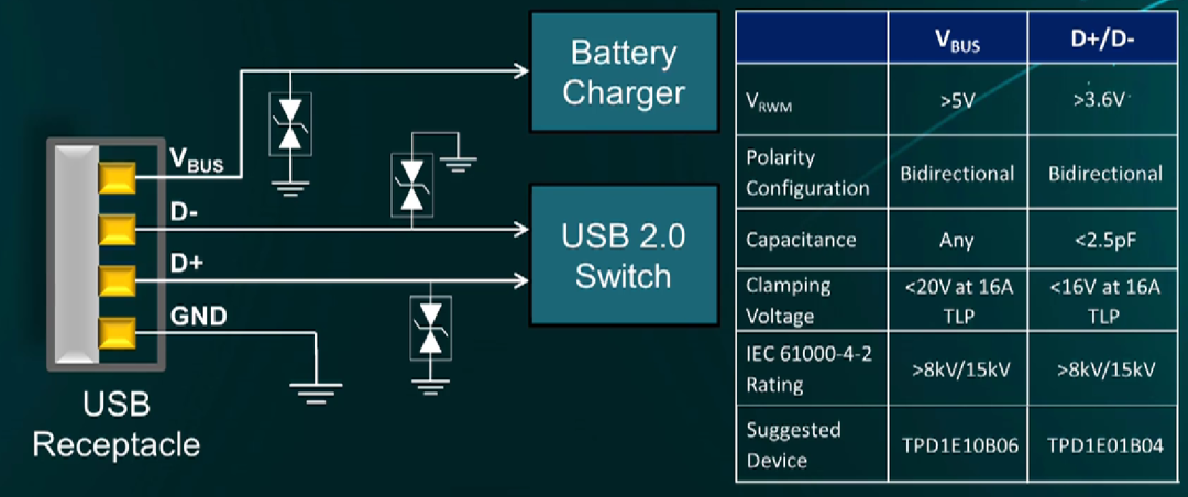 由于Vbus是直流电源信号,电容不会影响其性能。然而,对于高速 USB,D+/D- 可以达到 480 兆位/秒,所以应该考虑电容。选择TVS管结电容小于2.5pF。