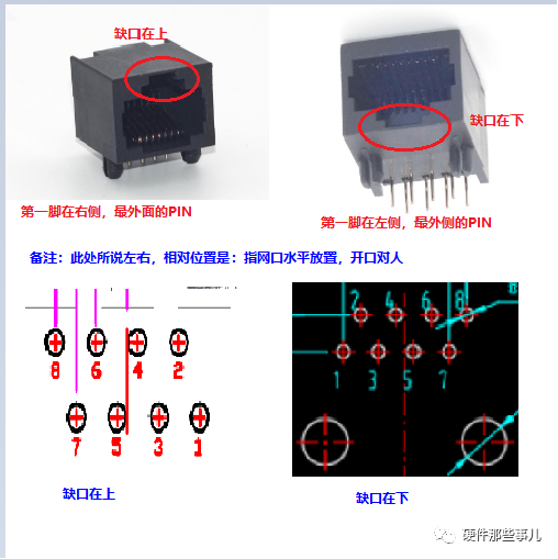 2.为了避免类似错误再次发生,我们也可以对RJ45的PIN脚定义做一个总结,因为RJ45也是属于标准器件,其实它的第一PIN也是标注,就算我们不看规格书,只要理解了它的标准定义,也是可以知道它的第一PIN。