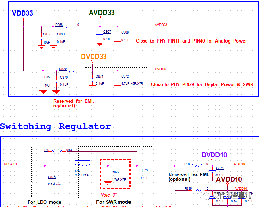 –整个芯片就两组电压,3.3V和1.0V(内置DC_DC转换),测量发现3.3V电压正常,1.0V无输出,同时25M 晶体也没有起振。由此我们判断此PHY芯片还没有正常工作,应该是软件驱动没有适配好,于是让软件同事检查软件配置及设置相关。