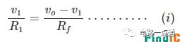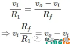 在上述电路中,反相输入端连接了一个外部电阻 R1和 反馈电阻 Rf。现在,通过应用基尔霍夫电流定律,可以得到: