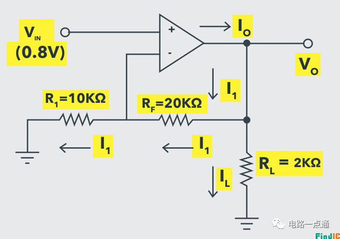 由于运算放大器的输入电流为零,因此相同的 I1必须流过电阻 R f。