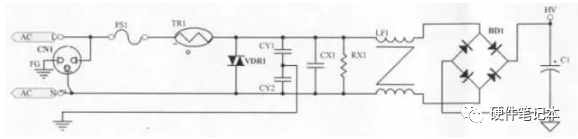 Y-Cap一般可分为Y1及Y2电容,若AC Input有FG(3 Pin)一般使用Y2- Cap , AC Input若为2Pin(只有L,N)一般使用Y1-Cap,Y1与Y2的差异,除了价格外(Y1较昂贵),绝缘等级及耐压亦不同(Y1称为双重绝缘,绝缘耐压约为Y2的两倍,且在电容的本体上会有“回”符号或注明Y1),此电路因为有FG所以使用Y2-Cap,Y-Cap会影响EMI特性,一般而言越大越好,但须考虑漏电及价格问题,漏电(Leakage Current )必须符合安规须求(3Pin公司标准为750uA max)。
