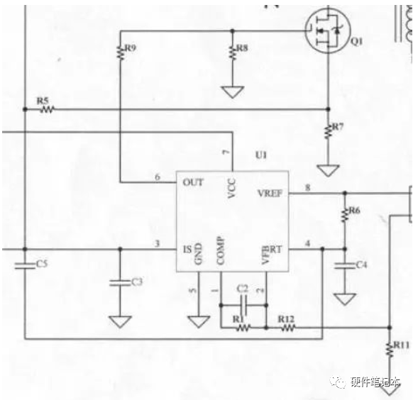 R9电阻的大小,会影响到EMI及温升特性,一般而言阻值大,Q1 turn on / turn off的速度较慢,EMI特性较好,但Q1的温升较高、效率较低(主要是因为turn off速度较慢);若阻值较小, Q1 turn on / turn off的速度较快,Q1温升较低、效率较高,但EMI较差,一般使用51Ω-150Ω 1/8W。