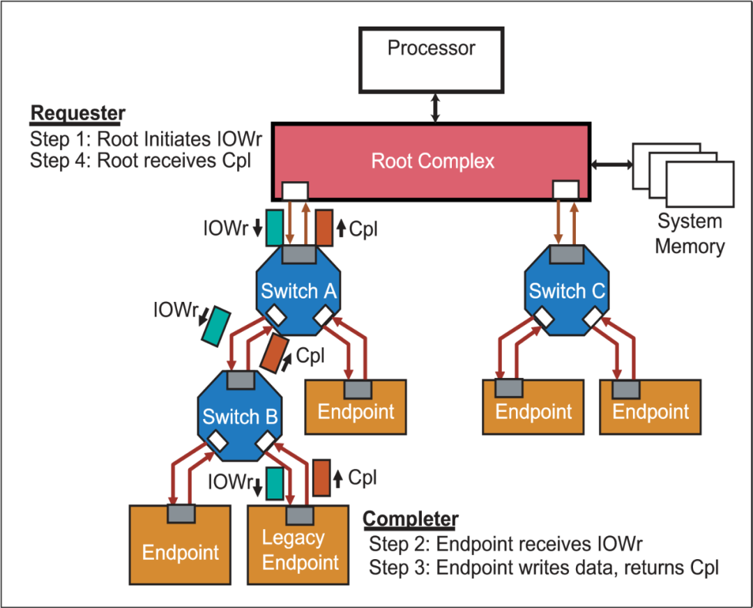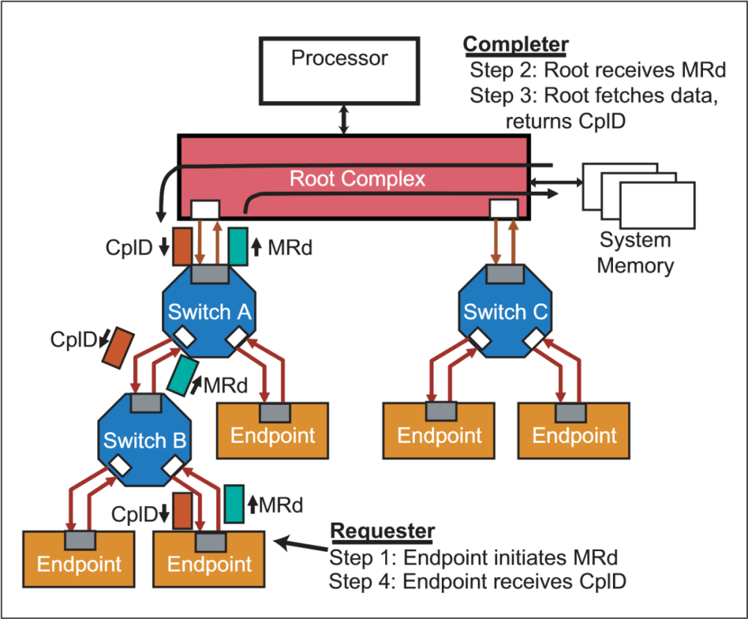 4.步骤4a:交换机对CplD TLP中的“请求者ID”字段进行解码,并将数据包路由到正确的出口端口,将副本保存在出口端口的重传缓冲区中。请求者收到CplD TLP并检查错误。