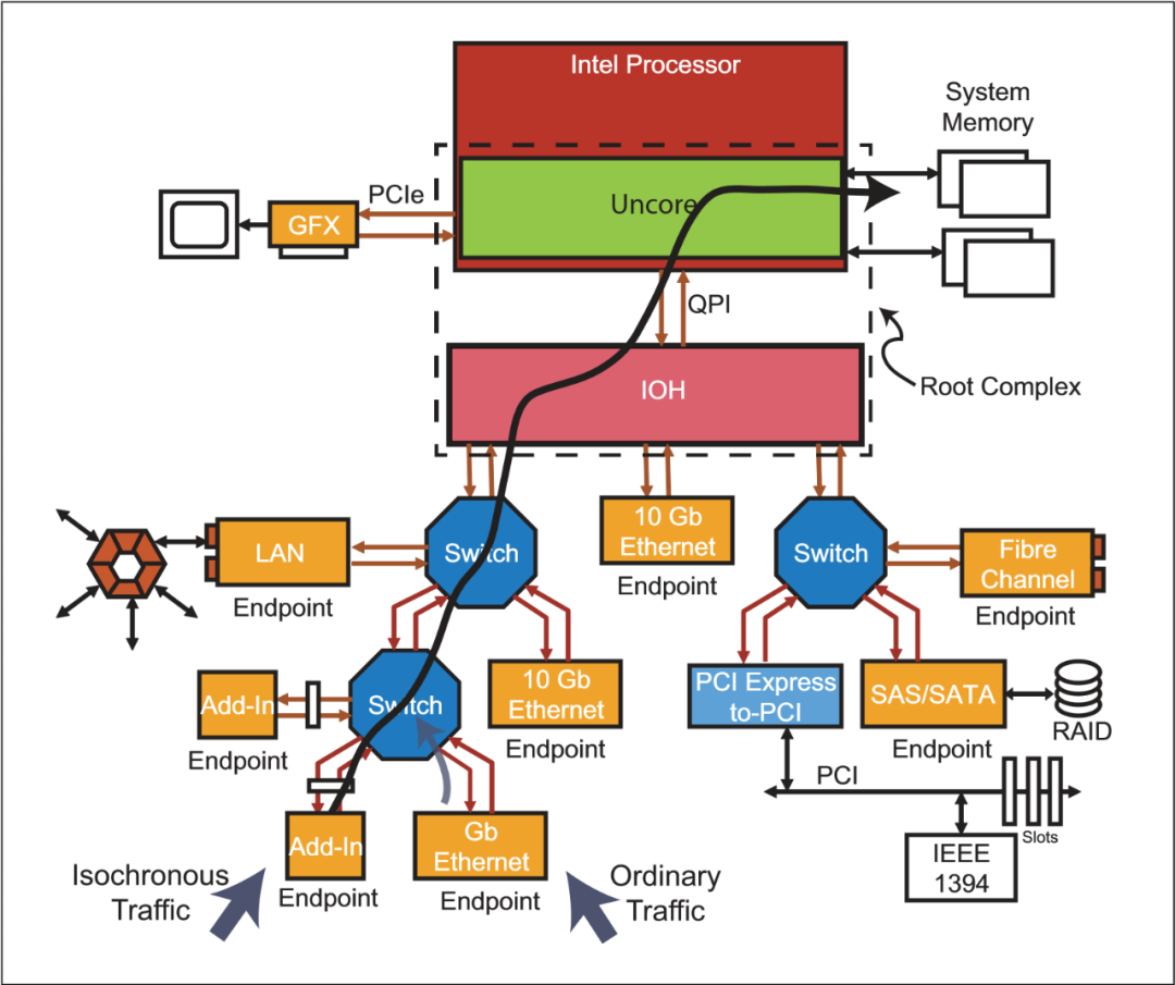 PCIe从一开始就被设计为能够支持对时间敏感的事务,例如,诸如音频或视频流之类的应用程序,在这些应用程序中必须及时传送数据才能有用。这被称为提供服务质量(Quality of Service),它通过添加一些内容来实现。首先,软件会通过在每个数据包中设置一个3位字段(称为流量类别TC/Traffic Class)为它分配优先级。一般而言,为数据包分配编号更高的TC有望使其在系统中具有更高的优先级。其次,在每个端口的硬件中内置了多个称为虚拟通道(VC)的缓冲区,并且根据其TC将数据包放入适当的缓冲区中。第三,由于端口现在具有多个缓冲区,并且在给定时间可以传输数据包,因此需要仲裁逻辑在VC之间进行选择。最后,交换机必须在竞争的输入端口之间进行选择,才能访问给定输出端口的VC,这称为端口仲裁,可以是硬件分配的,也可以是软件编程配置。所有这些硬件都必须在适当的位置,以使系统能够对数据包进行优先级排序。如果正确地编程和设置,这样的系统可以为给定路径提供有保证的服务。