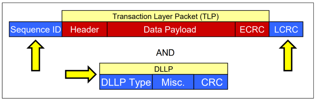 DLLPs(数据链路层数据包):DLLP在链路上两个相邻设备的数据链路层之间传输。事务层甚至不知道这些数据包,这些数据包仅在相邻设备之间传播,并且没有路由到其他任何地方。与TLP相比,它们很小(总是只有8个字节),这是一件好事,因为它们代表了维护链路(Link)协议的开销。