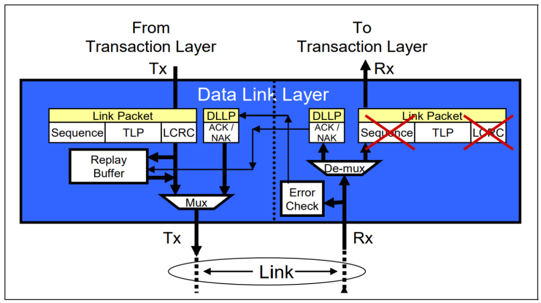 如果接收方检测到TLP错误,它将丢弃TLP并将Nak返回给发送方,然后发送方重传所有未确认的TLP,以期在下一次获得更好的结果。由于检测到的错误几乎总是瞬态事件,因此重传通常会在短时间内纠正问题。此过程通常称为Ack/Nak协议(Acknowledge/NotAcknowledge)。