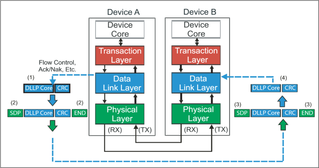 DLLP拆包(DLLP Disassembly):当物理层接收到DLLP时,将对比特流进行解码,并删除开始和结束帧字符。其余的数据包转发到数据链路层,后者检查CRC错误,然后根据数据包采取适当的措施。数据链接层是DLLP的目标,因此它不会转发到事务层。