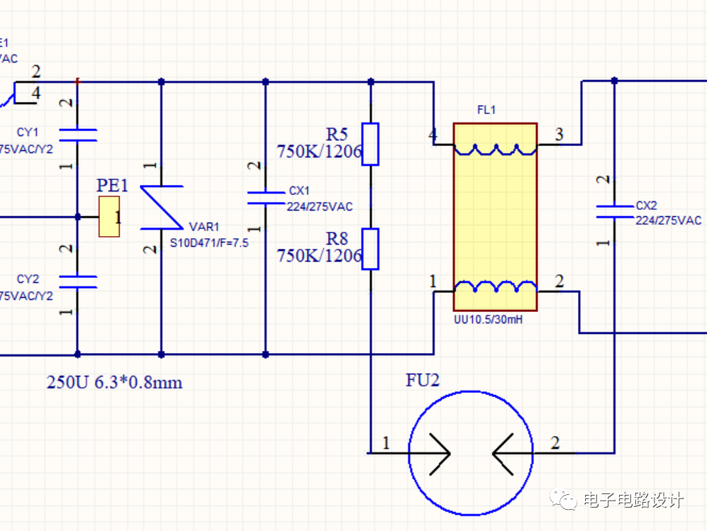 放电齿,也叫放电间隙或者火花间隙。放电齿是一对指向彼此相对的锐角的三角形,是由在PCB布线过程中使用铜箔层作出来的。这些三角形需设置在PCB板元器件的另一层放置,不能被绿油等盖住。在浪涌测试或者ESD测试时,共模电感两端将产生高压,出现飞弧。若与周围器件间距较近,可能使周围器件损坏。因此可在其上并联一个放电管抑制它电压。如下图FU2为气体放电管,并联在共模电感两端,它能够从而起到灭弧的效果。