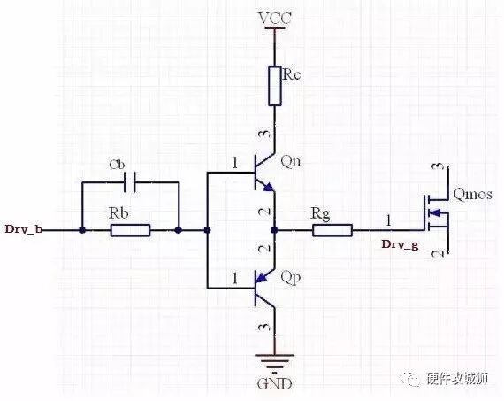 左边一个输入驱动信号Drv_b(驱动能力很弱)通过一个图腾柱输出电路,从三极管的发射极公共端出来得到驱动能力(带载能力)大大增强的信号Drv_g;从能量的角度来讲,弱能量信号Drv_b通过Qn和Qp的作用,从Vcc取电(获取能量),从而变成了携带高能量的Drv_g信号;在这个能量传递的过程中,Qn和Qp分别交替工作在截至和饱和状态;