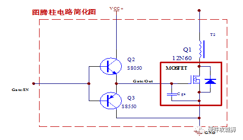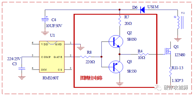 图腾柱放大电路由两个三极管Q2和Q3构成,上管是NPN型三极管,下管是PNP型三极管;NPN型三极管的集电极接变压器辅助绕组供电输出端,与R7相连,与芯片共用同一VCC,供电电压为20V,该电路从直流角度看是串联的,两对管共射联接处为输出端,本电路结构类似于乙类推挽功率放大器OCL。