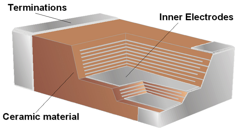 A:多层陶瓷电容器是由印好电极(内电极)的陶瓷介质膜片以错位的方式叠合起来,经过一次性高温烧结形成陶瓷芯片,再在芯片的两端封上金属层(外电极)制成的电容。