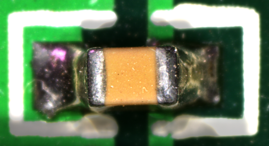 首先使用超景深数码显微镜进行外观立体观察,检查电容表面是否有开裂,多角度检查引脚侧面焊锡爬升情况。电容外观完好,没有外部裂纹,焊锡爬升良好。