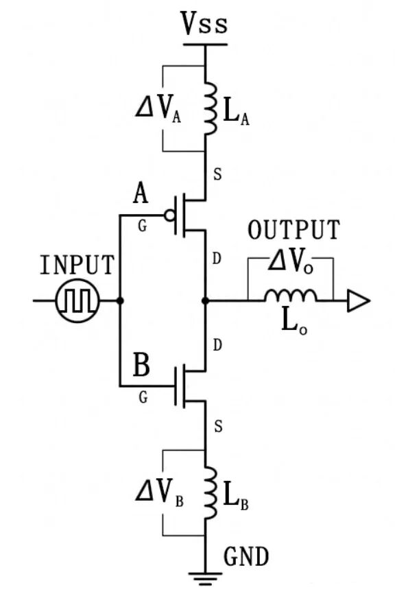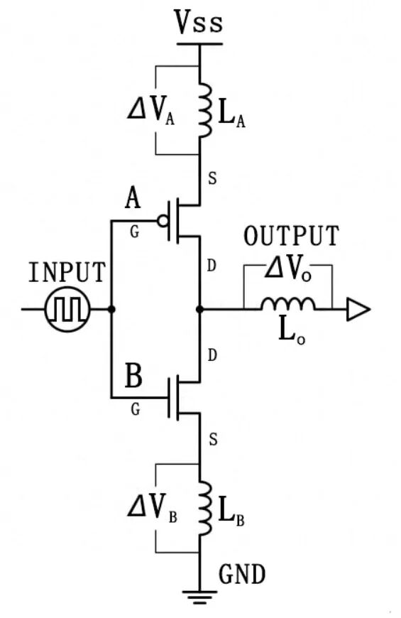 为了更好地理解接地反弹,可以看下面的推挽电路,该电路可以提供逻辑低或者逻辑高输出。