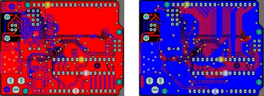 有时候,在物理上不可能将去耦电容放置在靠近IC的位置。但是,如果将其放置在远离IC的地方,则会产生电感环路,从而导致接地反弹问题更严重。如果这样的话,可以将去耦电容放置在IC下方PCB的另一侧。