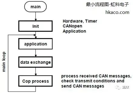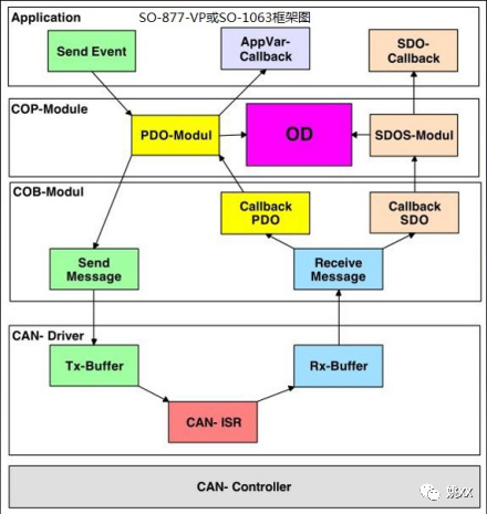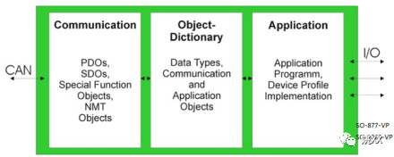 通讯单元 处理和网络上其他模组通讯所需要的通讯协定。 设备的启动及重置由状态机(state machine)控制。状态机需包括以下的几个状态:Initialization, Pre-operational, Operational 及 Stopped。当接收到网络管理 (NMT) 通讯对象,状态机会转换到对应的状态。 对象字典 (Object Dictionary) 是一个有 16 位元索引 (Index) 的变量阵列。每个变量可以(但非必须)有 8 位元的子索引 (Subindex)。变量可用来调整设备的组态,也可以对应设备量测的资料或设备的输出。 当状态机设定为 operational 之后,设备的应用 (application) 部份就会实现设备预期的机能。此部份可以由对象字典中的变量调整其设定,而资料由通讯层传送或接收。