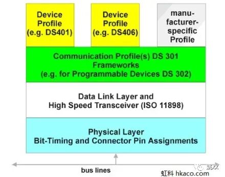 就OSI通信系统模型而言,CAN覆盖前两个级别:物理层和数据链路层。物理层定义了所使用的线路,电压,高速特性等。标准的CAN协议实现数据链路层,它是基于帧的(消息)协议。CANopen涵盖了上面五层:网络(寻址,路由),传输(端到端可靠性),会话(同步),表示(以标准方式编码的数据,数据表示)和应用。应用层描述了如何配置,传输和同步CANopen设备。