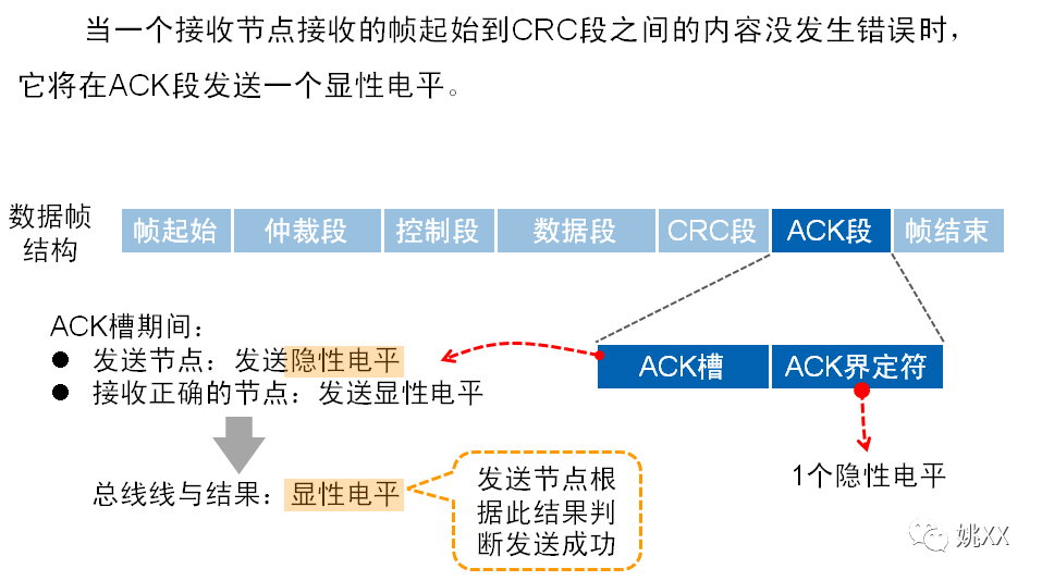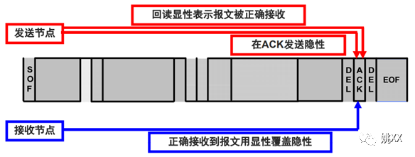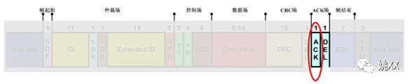 包含确认位(ACK slot)和界定符(Delimiter,DEL)。ACK在发送节点发送时,为隐性位。当接收节点正确接收到报文时,对其用显性位覆盖。DEL界定符同样为隐性位,用于隔开。