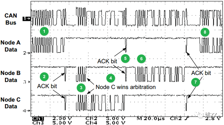 不同于其它类型的总线,CAN总线不设定节点的地址,而是通过消息的标识符(Identifier)来区别消息。CAN总线消息是广播式的,也就是说在同一时刻所有节点都检测到同样的电平信号。
