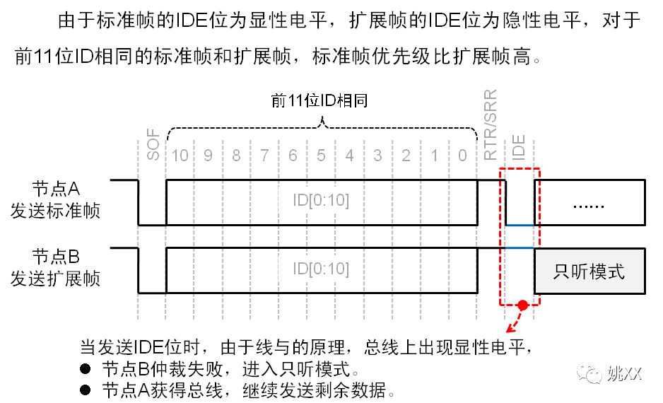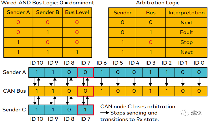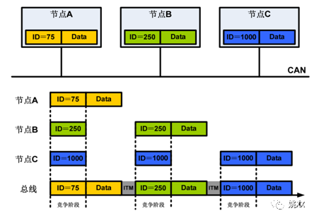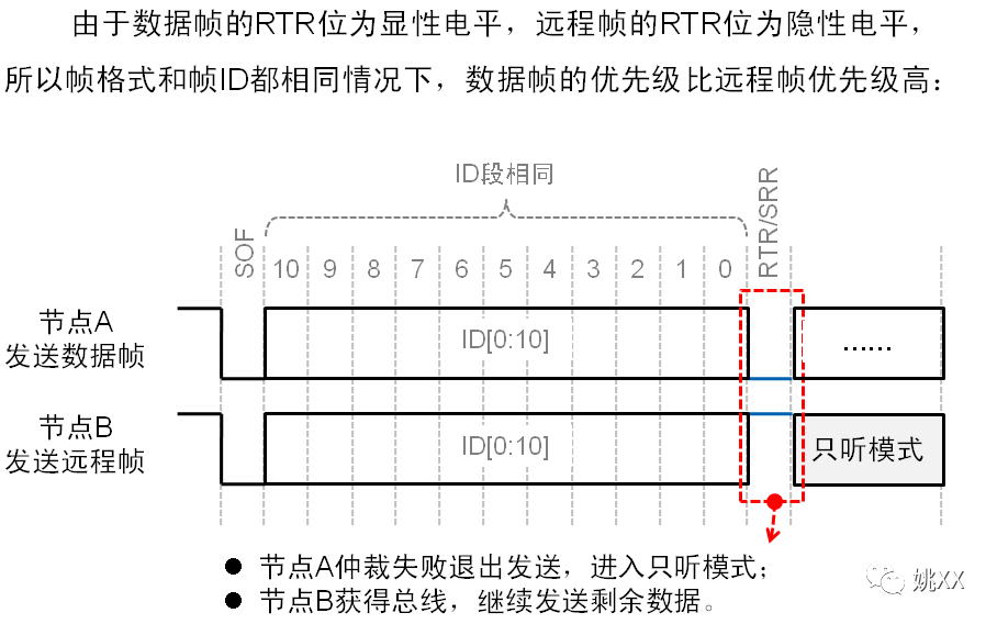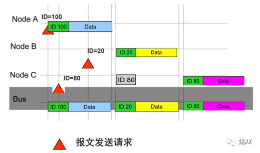 - 非破坏性仲裁机制:通过ID仲裁,ID数值越小,报文优先级越高。