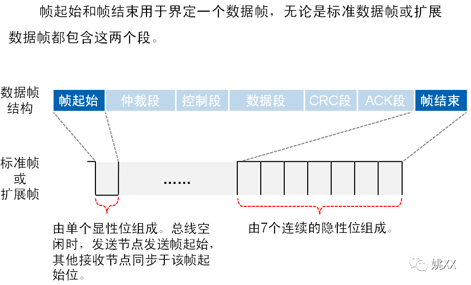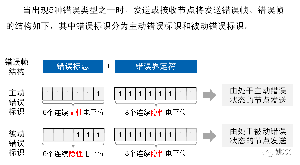 - 主动错误标志(6个显性位): 处于主动错误状态的单元检测出错误时输出的错误标志