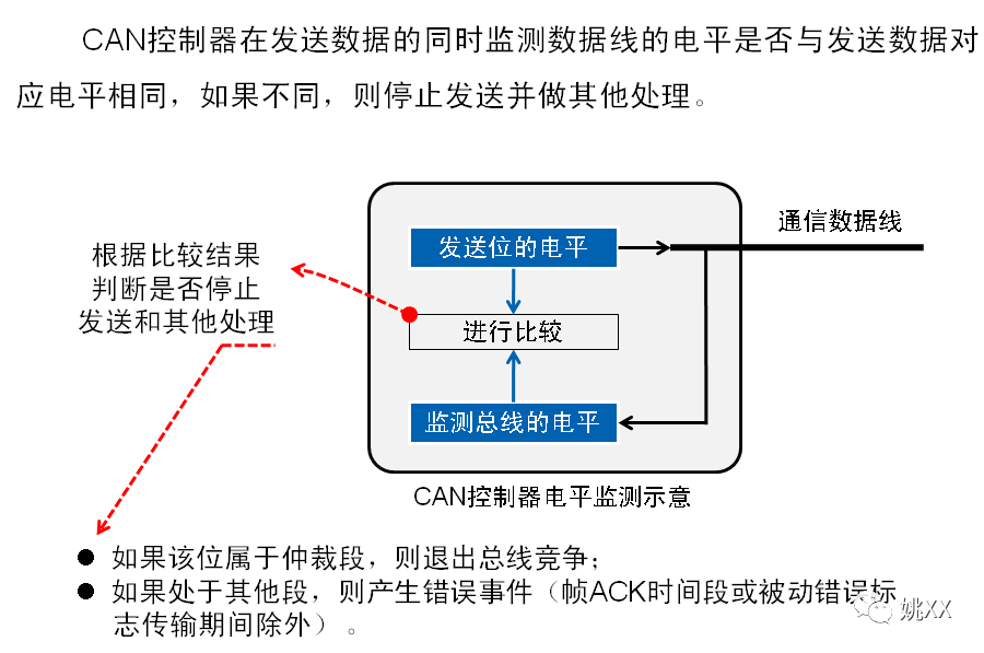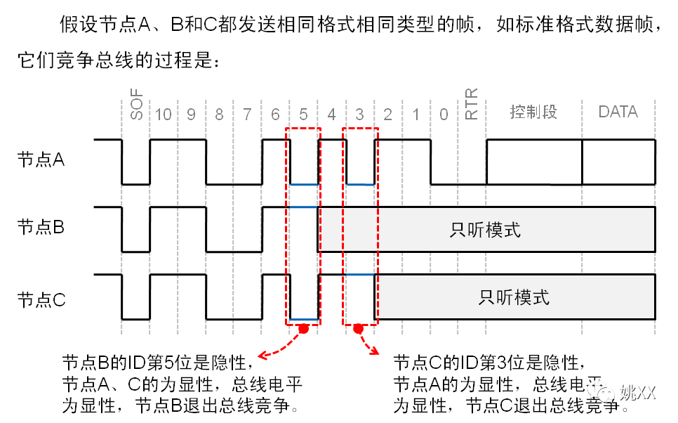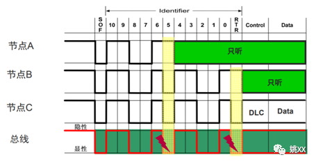 - 冲突检测:节点在发送数据时,要不停的检测发送的数据,确定是否与其他节点数据发送冲突,如果有冲突,则保证优先级高的报文先发送。