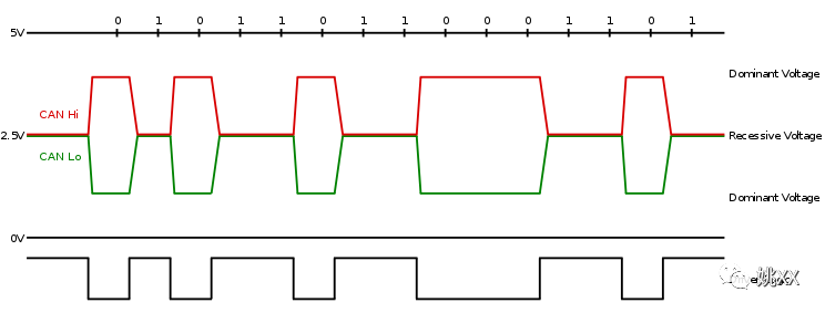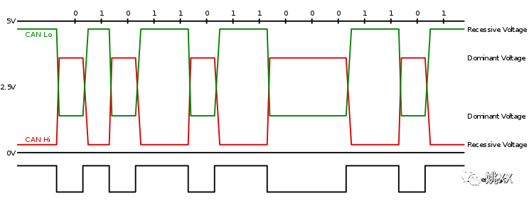 低速CAN,定义CANH和CANL电压相差 5V (CANH = 0V, CANL = 5V)时为逻辑“1”,相差 2.2V (CANH = 3.6V, CANL = 1.4V)时为逻辑“0”。