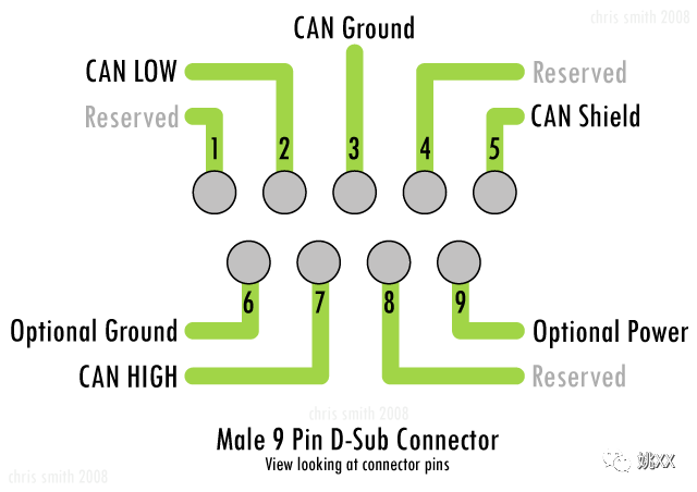 在前文有提到,业界只规定了9 Pin D-Sub 类型的CAN总线连接器,其信号定义如图8所示。