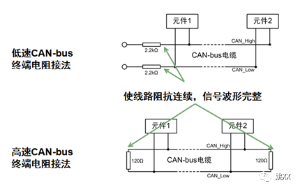 高速CAN总线最高信号传输速率为1Mbps,支持最长距离40m。ISO11898-2要求在高速CAN总线两段安装端接电阻RL(端接电阻一般为120Ω,因为电缆的特性阻抗为120 Ω,为了模拟无限远的传输线。)以消除反射。低速CAN最高速度只有125Kbps,所以ISO11898-3没有端接要求。