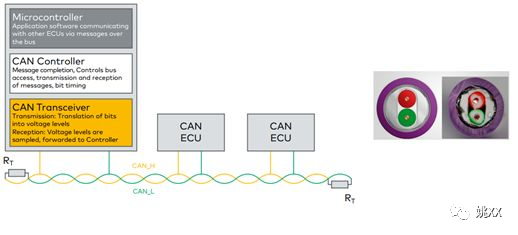 CAN收发器包括 CANH 和 CANL 两根信号,CANH和CANL信号采用差分电平,这样可以取得更好的电磁兼容效果。CAN总线物理传输媒介只需要两根线。