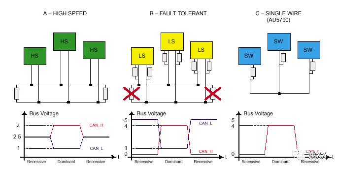 三种CAN总线物理层的对比如表3列出。总线连接拓扑图如图9,对于端接,高速CAN端接是在总线两端,而低速CAN和单线CAN的端接都是在各节点位置。