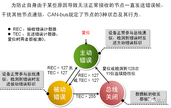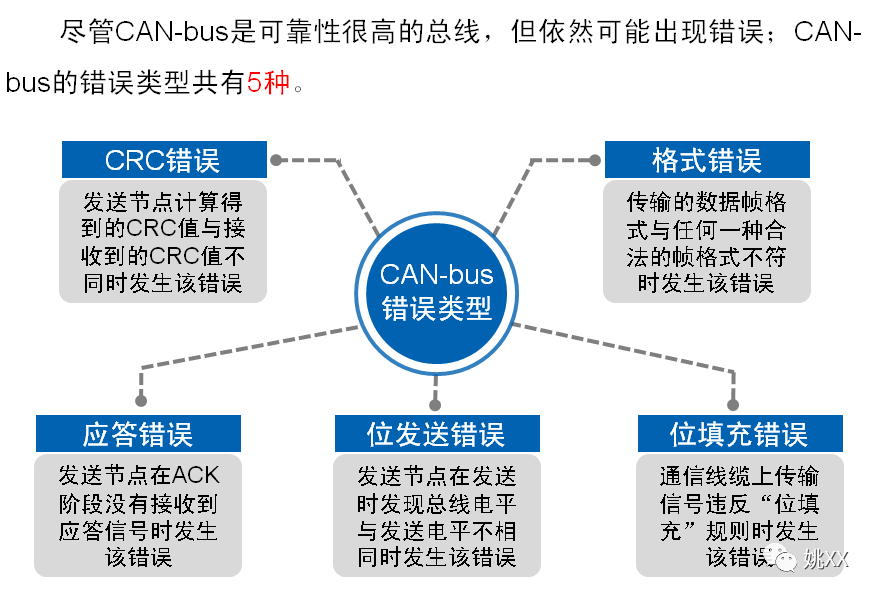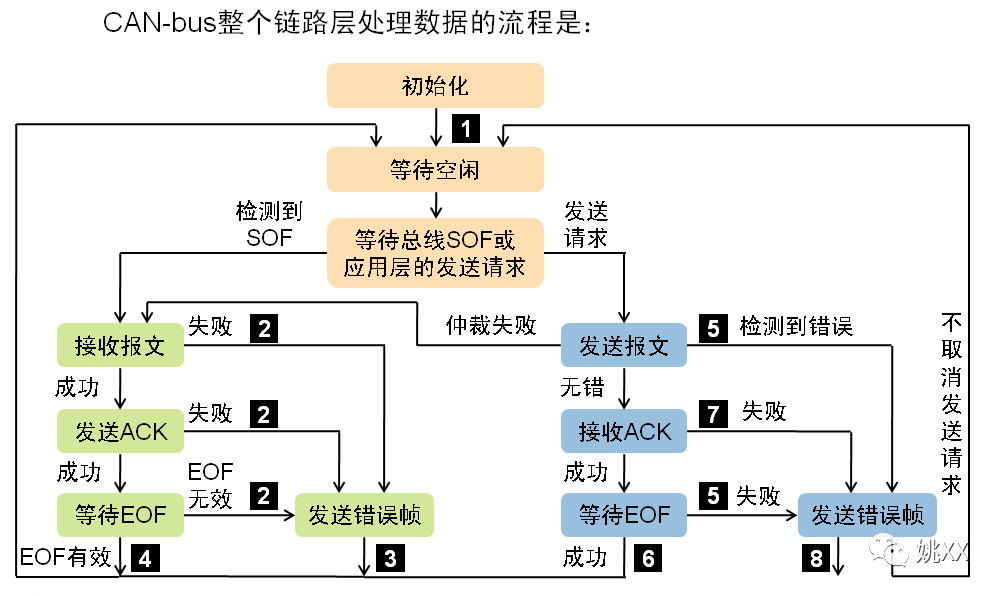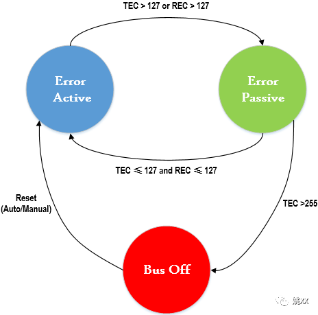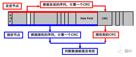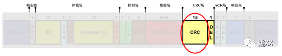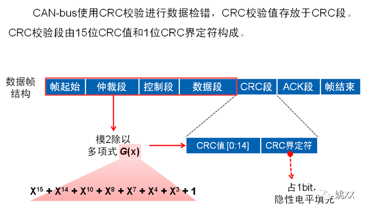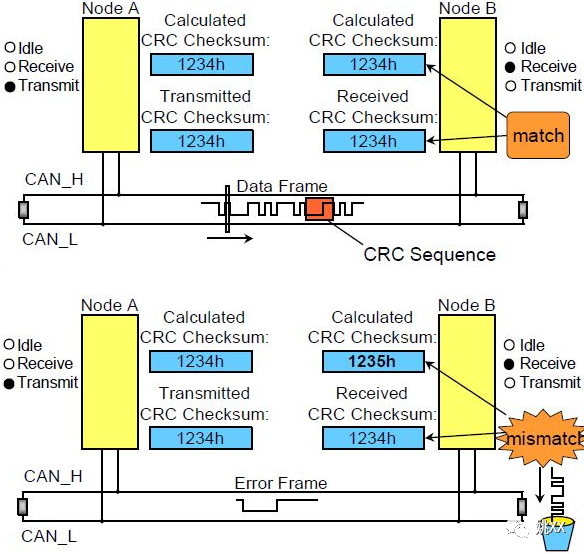 为了保证报文的正确传输,CAN的报文包含了一段15位的CRC校验码,一旦接收端计算出的CRC码跟接收到的CRC码不同,就会向发送端反馈出错信息以及重新发送。CRC部分的计算和出错处理一般由CAN控制器硬件完成,或由软件控制最大重发数。