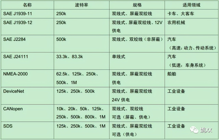 虽然底层标准相同,不同应用领域和组织会制定不同的上层标准。有的厂商开发并推广其应用层标准,在某些领域得以广泛应用。对于汽车行业来说,几乎每家厂商都有自己的CAN上层标准。比较流行的有工业自动化领域 CiA的 CANopen,Rockwell的 DeviceNet;嵌入式控制领域 Kvaser的 CAN Kingdom;智能设备控制 Honeywell的 SDS;汽车诊断 ISO 14229定义的 UDS,和中重型汽车CAN总线标准 SAE J1939。如表1示。