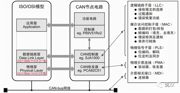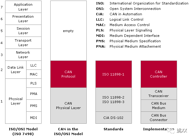 CAN底层标准涵盖OSI模型中的物理层和数据链路层,底层标准包括: