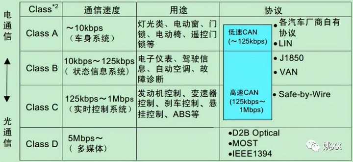 同时,面向汽车的通信协议以通信速度为准进行了分类: