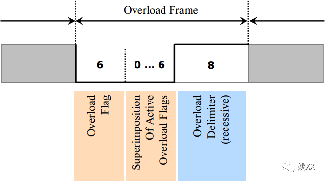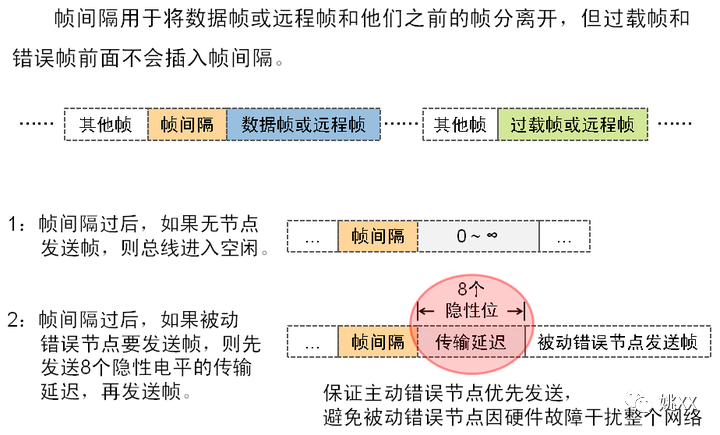 - 被动错误标志(6个隐性位): 处于被动错误状态的单元检测出错误时输出的错误标志
