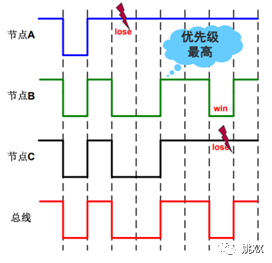 发送低优先级报文的节点退出仲裁后,在下次总线空闲时自动重发报文。