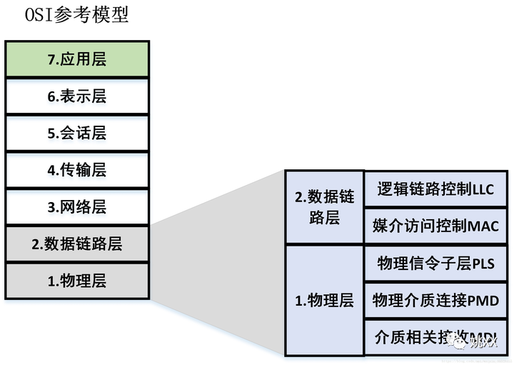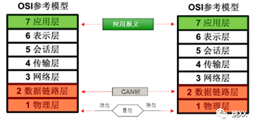 OSI参考模型为7层,物理层、数据链路层、网络层、传输层、会话层、表示层和应用层,而CAN通信底层仅使用了物理层和数据链路层