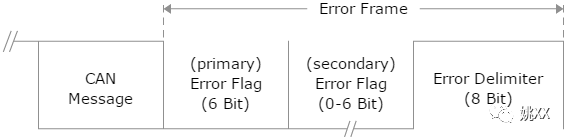 用于在接收和发送消息时检测出错误时,通知错误的帧。错误帧由错误标志和错误界定符构成。错误帧的帧结构如图11示。