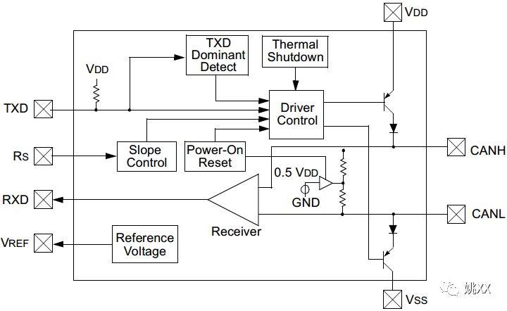 前面的标准部分有介绍,CAN总线分高速CAN和低速CAN,收发器因之也分为高速CAN收发器(1Mbps)和低速CAN收发器(125Kbps)。低速CAN也叫 Fault Tolerant CAN ,指的是即使总线上一根线失效,总线依然可以通信。图4示例高速CAN收发器的基本电路结构。当两个晶体管都关断时,CANH和CANL上电压相同,且都为 0.5VCC ;而当两个晶体管都打开时,CANH 和 CANL 上即存在一定的压差,且压差与负载电阻值相关。ISO 11898-2 要求此时 CANH 和 CANL 压差在 2V*左右。