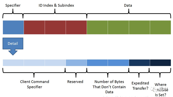 于是,CANBUS 可怜的8个字节又分成了三个部分。一个字节用于说明符,三个字节用于节点索引和子索引,四个字节用于传输中的实际数据,真正的数据只有4个字节了。