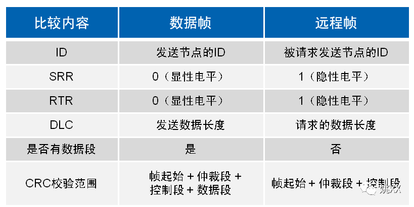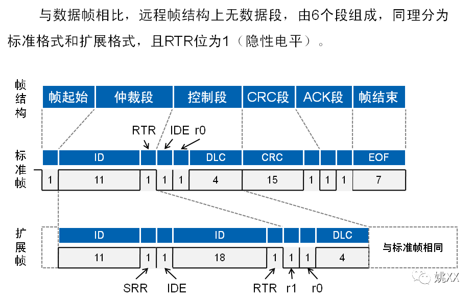 一般地,数据是由发送单元主动向总线上发送的,但也存在接收单元主动向发送单元请求数据的情况。远程帧的作用就在于此,它是接收单元向发送单元请求发送数据的帧。远程帧与数据帧的帧结构类似,如上图X所示。远程帧与数据帧的帧结构区别有两点: