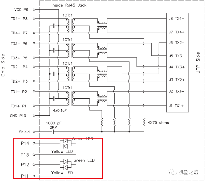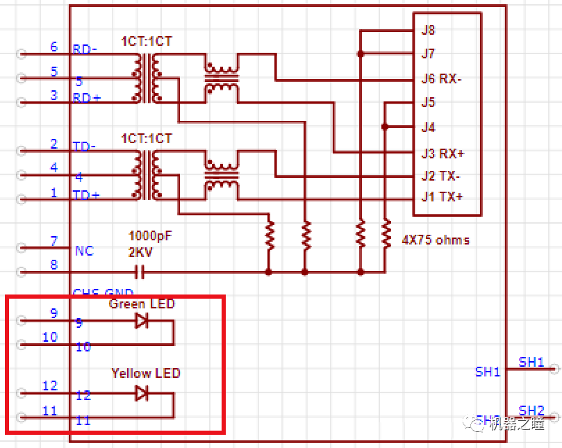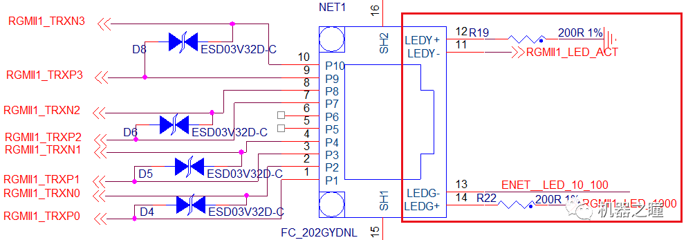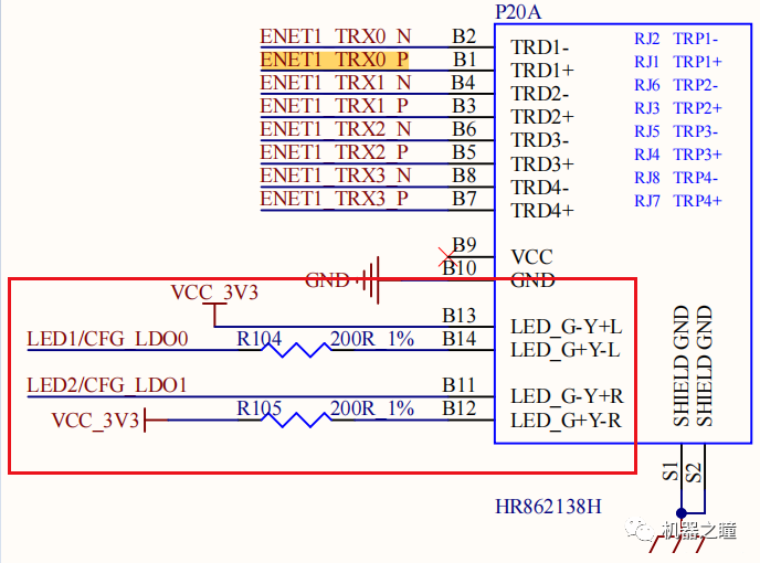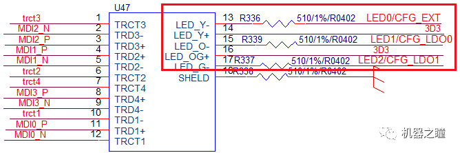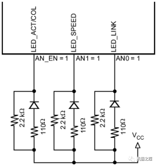 绿灯接到PHY的28脚(LINK),表示连接状态,串连240R的电阻连接到Vcc。黄灯接到PHY的26脚(ACT),表示网络数据通信,串连240R的电阻连接到Vcc。模式设置成模式1,通信自协商,需要将PHY的引脚26、引脚27、引脚28引脚通过2.2K电阻上拉到Vcc。