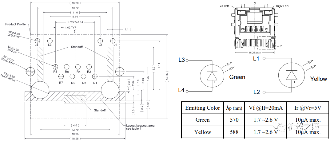 一般RJ45网口会有两个LED灯,一个是link灯,一个是ACT灯。参考下图所示,缺口朝上,一般右边绿灯常亮,表示link上,左边黄色、橘色、或者绿色灯闪烁,表示有数据传输。
