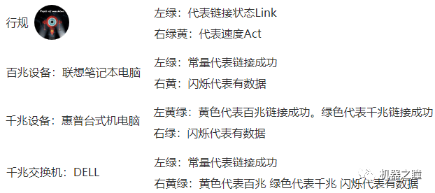 绿灯亮,网络已经连接。黄灯闪烁,网络数据收发。实际的灯的颜色表示状态要根据实际连接来确定,网络正常状态一般是一个常亮,一个闪烁。